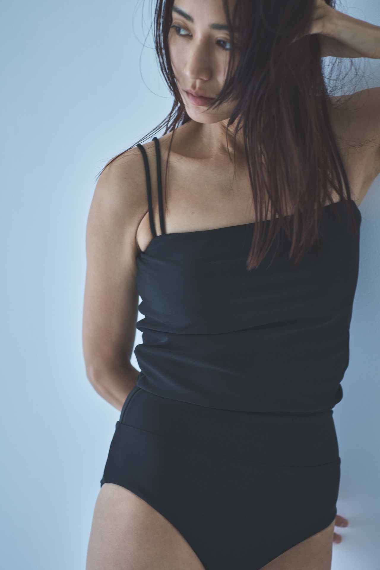 ワンピース見えだけど実はセパレート、動きによってチラッと素肌が見える丈。