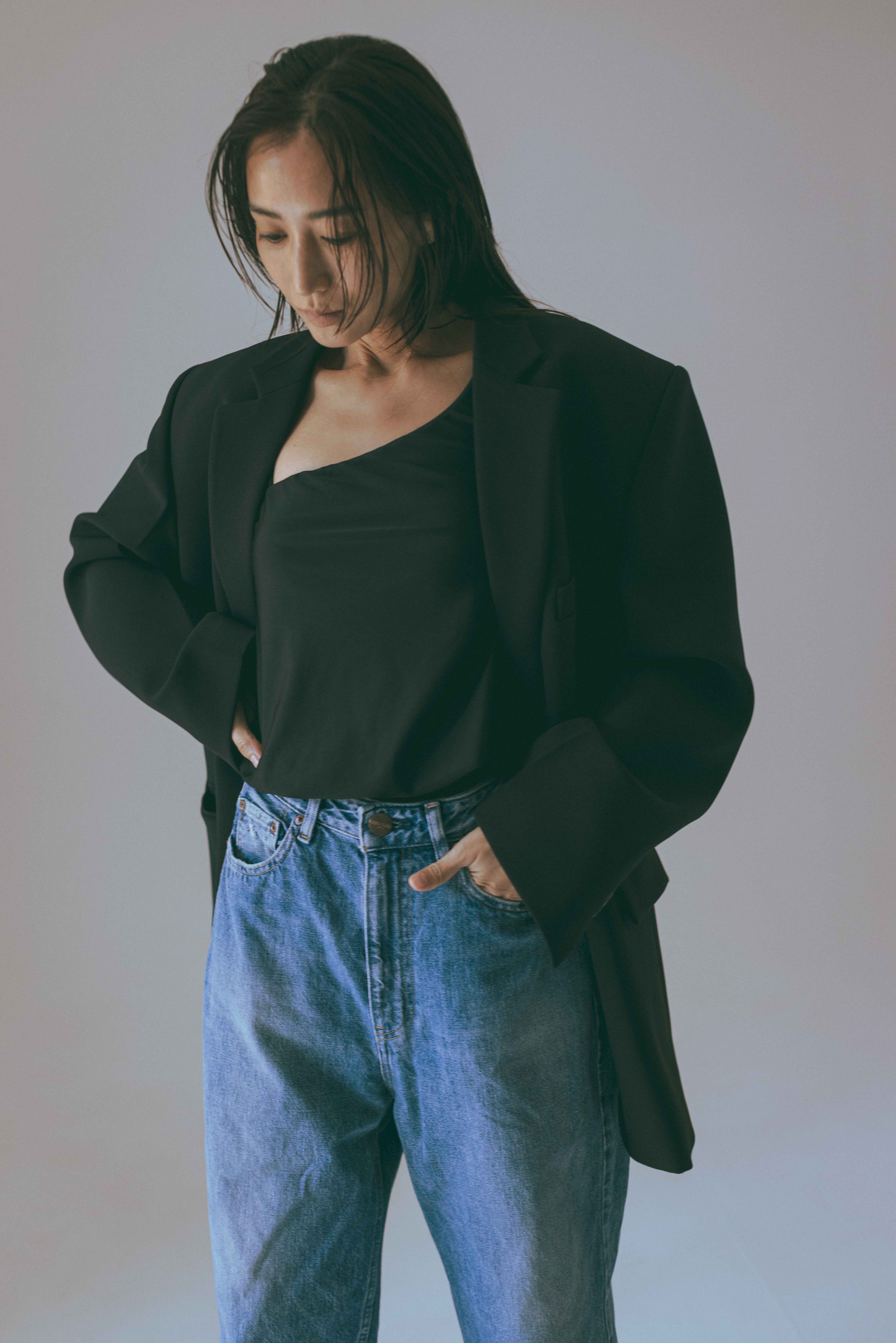 1枚で成立するデザインですが、ジャケットのINにした時、胸元の斜めのラインがオシャレに効いてきます。